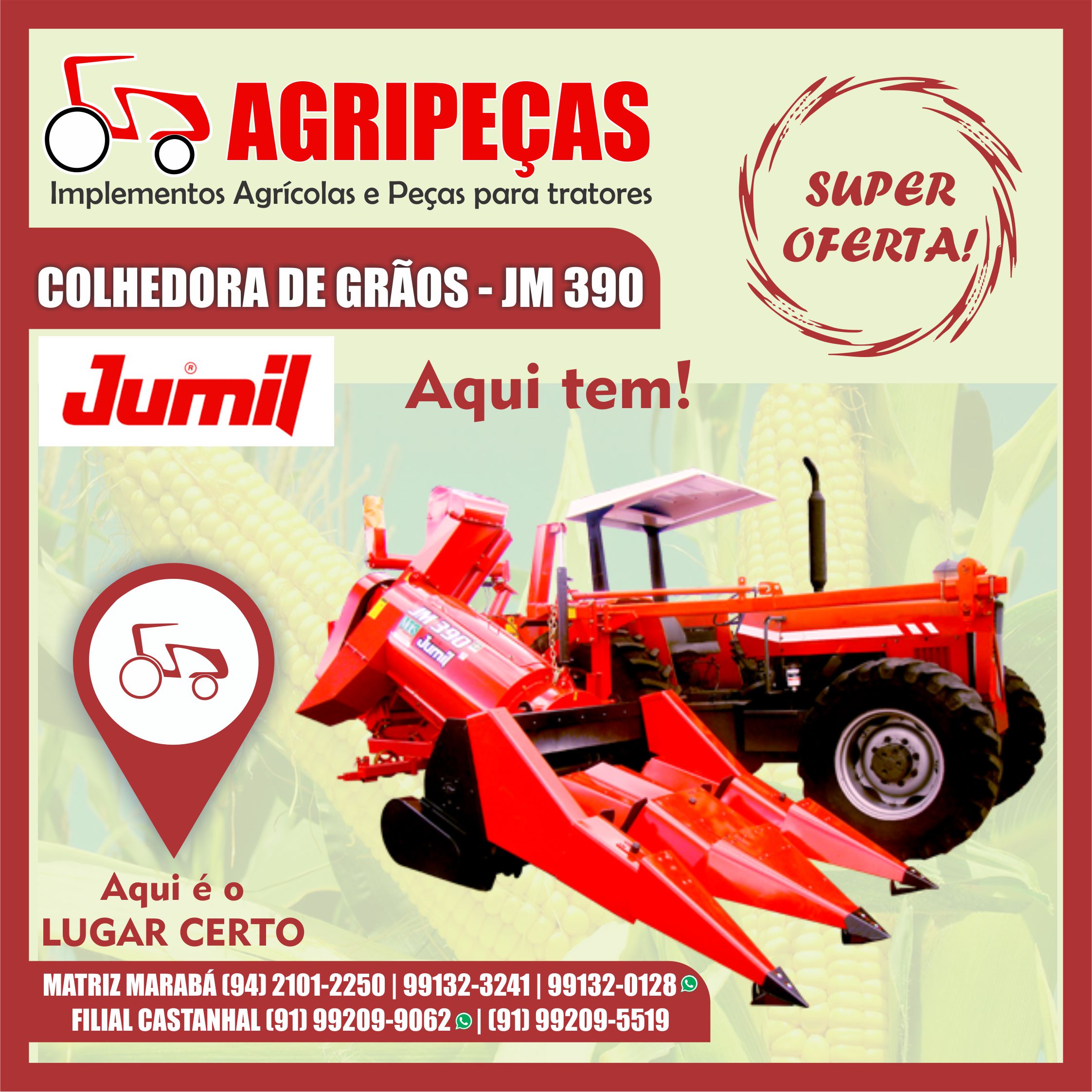 A Colhedora de Cereais JM390 foi desenvolvida com a mais alta tecnologia para atender o pequeno e médio produtor com acoplamento a tratores com potência mínima de 75 CV. Colhe milho, sorgo, soja, feijão, trigo, arroz e outros cereais. O sistema de acoplamento ao trator é efetuado através de para-choque desenvolvido de acordo com a marca e modelo do trator.